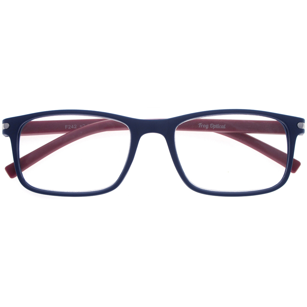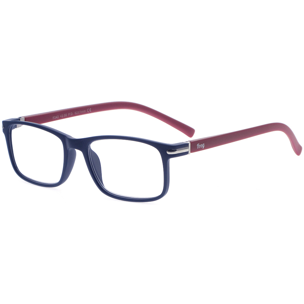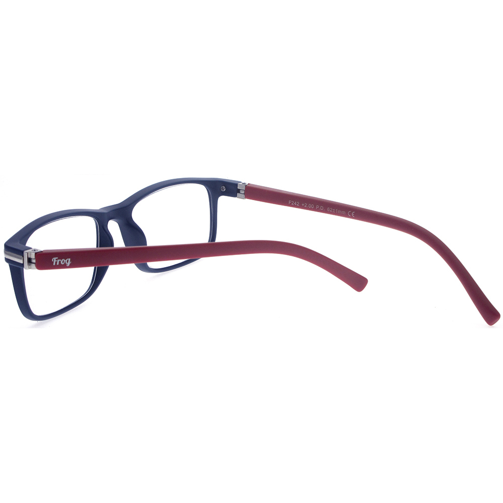Γυαλιά πρεσβυωπίας με σκούρα μπλε μετώπη και κόκκινους βραχίονες. Μοντέλο unisex.Πιστοποίηση ΕΟΦ για τους φακούς. Τα γυαλιά FROG OPTICAL αποτελούν την ιδανική επιλογή για άνετο και ξεκούραστο διάβασμα. Το προηγμένο σύστημα Flex, ενισχύει σημαντικά την ευκαμψία του βραχίονα και την ανθεκτικότητα του σκελετού. Παράλληλα, οι ασφαιρικοί φακοί υψηλής τεχνολογίας διασφαλίζουν τη μέγιστη οπτική ποιότητα, προσφέροντας αντιχαρακτική αντοχή, υψηλή ευκρίνεια, φυσική απεικόνιση, ευκολία στον καθαρισμό και βέλτιστη υδροφοβική δράση.