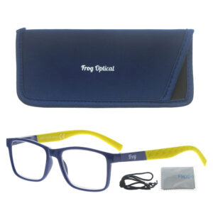 Γυαλιά πρεσβυωπίας με σκούρα μπλε μετώπη και κίτρινους βραχίονες.Μοντέλο unisex.Πιστοποίηση ΕΟΦ για τους φακούς. Τα γυαλιά FROG OPTICAL αποτελούν την ιδανική επιλογή για άνετο και ξεκούραστο διάβασμα. Το προηγμένο σύστημα Flex, ενισχύει σημαντικά την ευκαμψία του βραχίονα και την ανθεκτικότητα του σκελετού. Παράλληλα, οι ασφαιρικοί φακοί υψηλής τεχνολογίας διασφαλίζουν τη μέγιστη οπτική ποιότητα, προσφέροντας αντιχαρακτική αντοχή, υψηλή ευκρίνεια, φυσική απεικόνιση, ευκολία στον καθαρισμό και βέλτιστη υδροφοβική δράση.