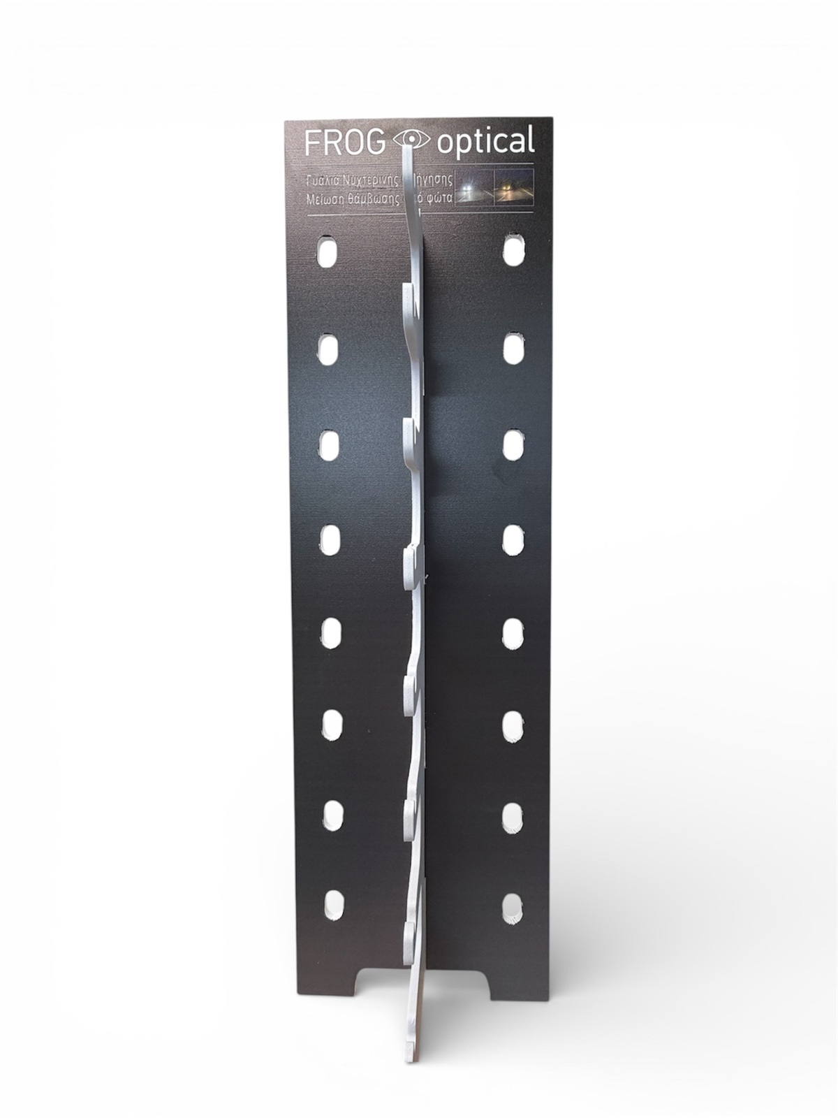 Σταντ προώθησης οπτικών κατασκευασμένο από λευκό PVC υλικό με προσθήκη εικαστικού επωνυμίας FROG OPTICAL με την τεχνολογία ψηφιακής εκτύπωσης UV. Ιδανικό για τον εξοπλισμό καταστημάτων οπτικών.