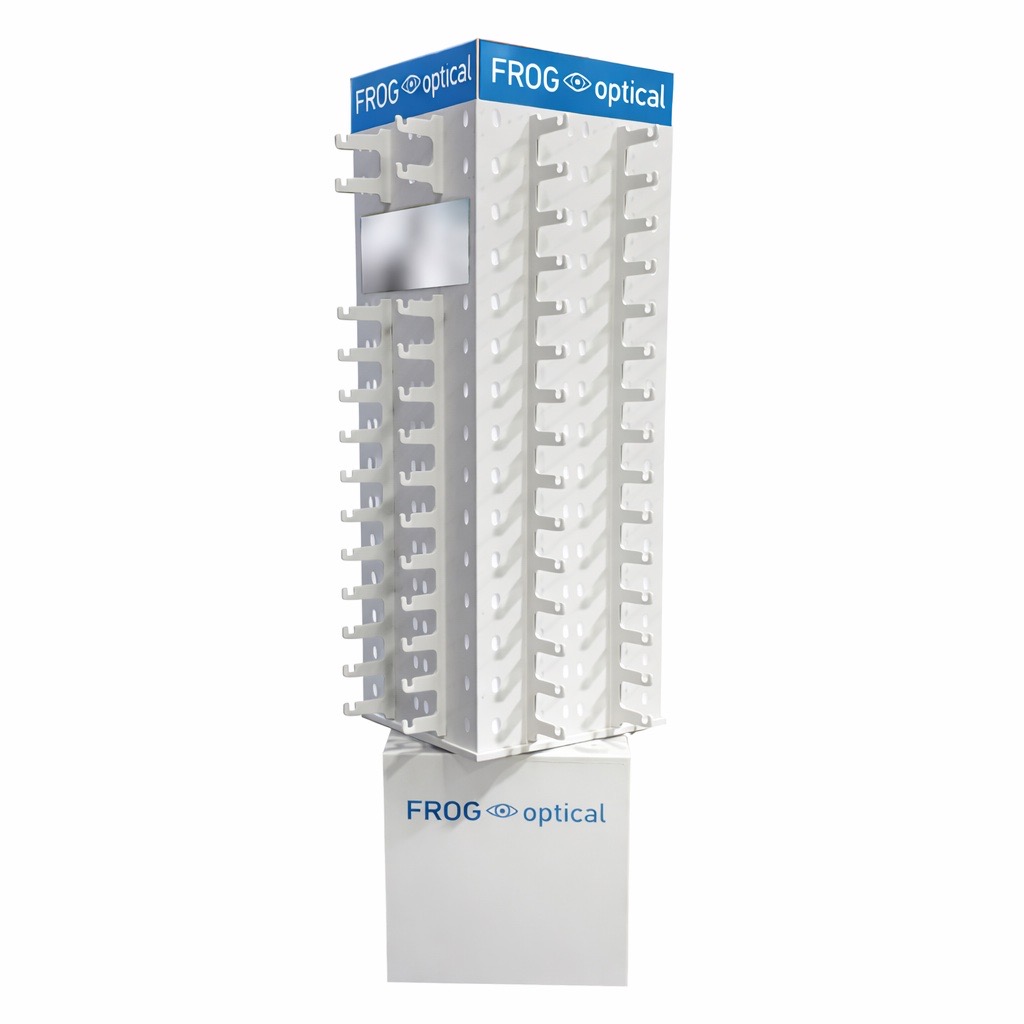PVC stand οπτικών για την εταιρεία Frog Optical με 132 θέσεις , ψηφιακή εκτύπωση λογοτύπου απευθείας στο υλικό στο επάνω μέρος και καθρέπτη για την δοκιμή των οπτικών. Διαστάσεις: 63 x 178 cm.