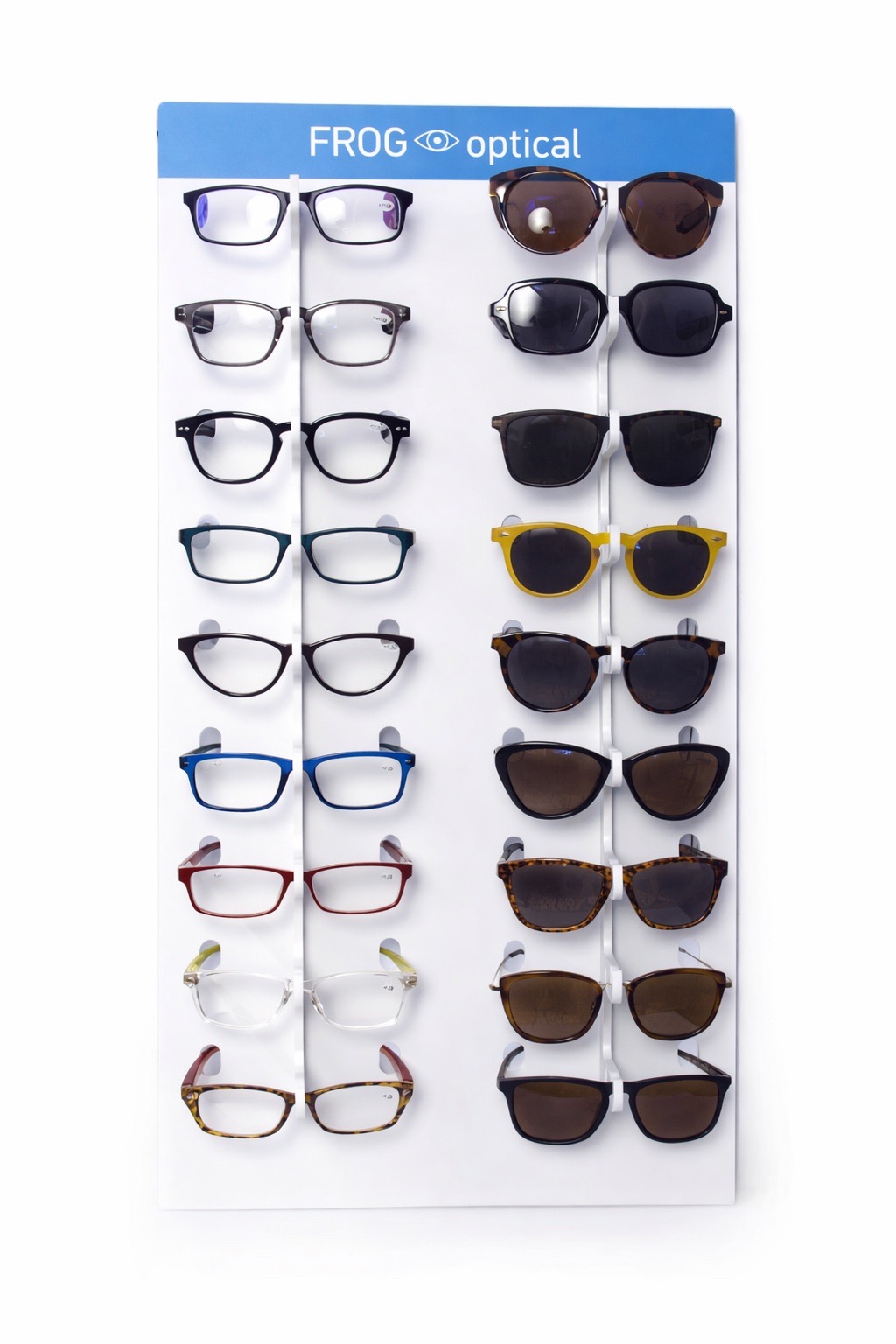 Stand οπτικών από PVC , με 18 θέσεις προβολής και ψηφιακή εκτύπωση λογοτύπου της εταιρείας οπτικών Frog optical . Διάσταση 20 X 36 X 70 cm.